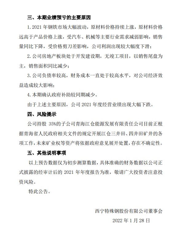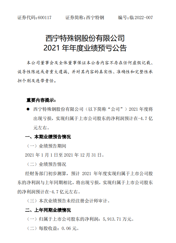 西寧特殊鋼股份有限公司2021年度業績預虧公告