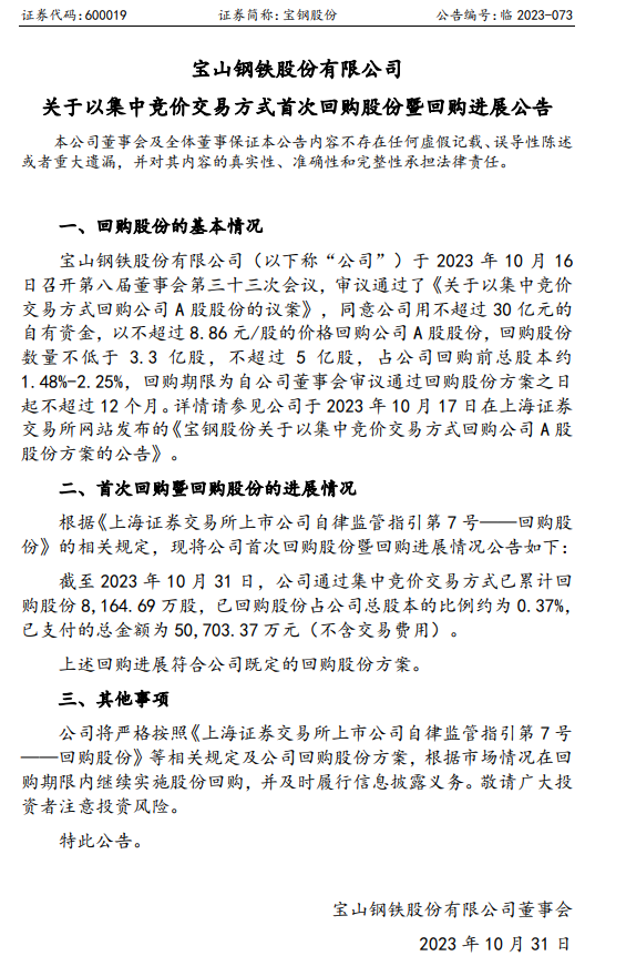 寶鋼股份:寶鋼股份關(guān)于以集中競價(jià)交易方式首次回購股份暨回購進(jìn)展公告