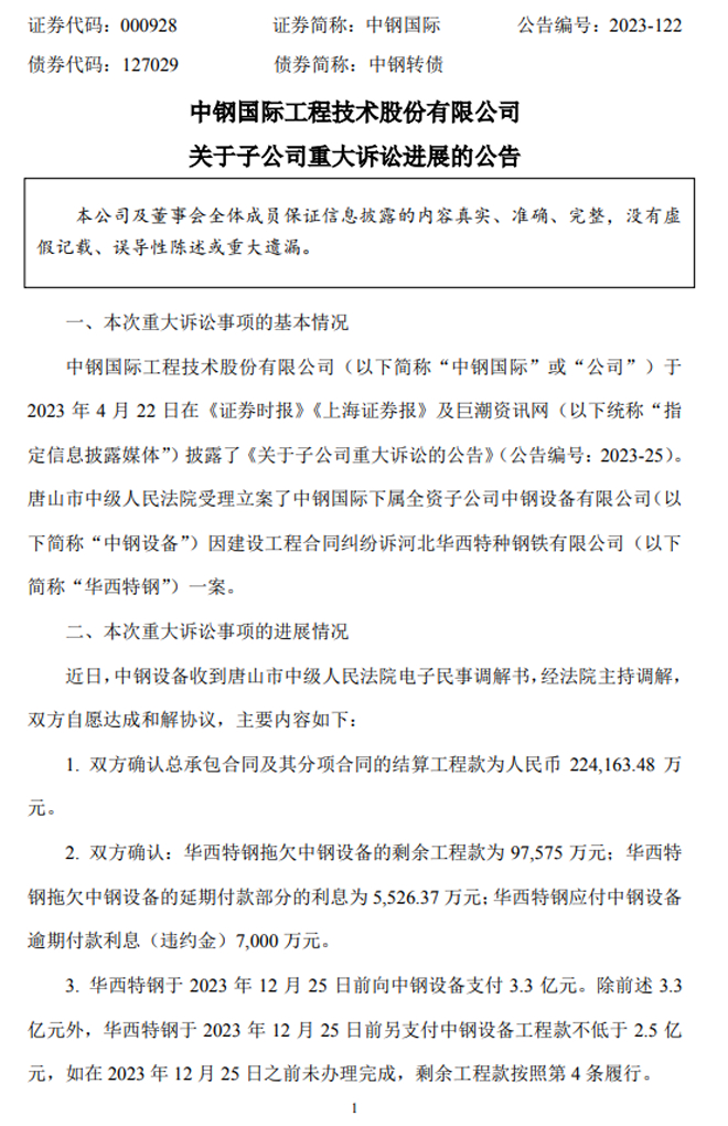 中鋼國(guó)際:關(guān)于子公司重大訴訟進(jìn)展的公告