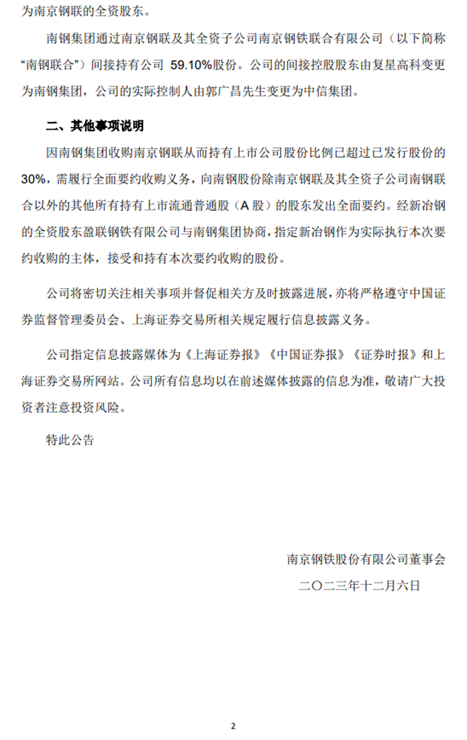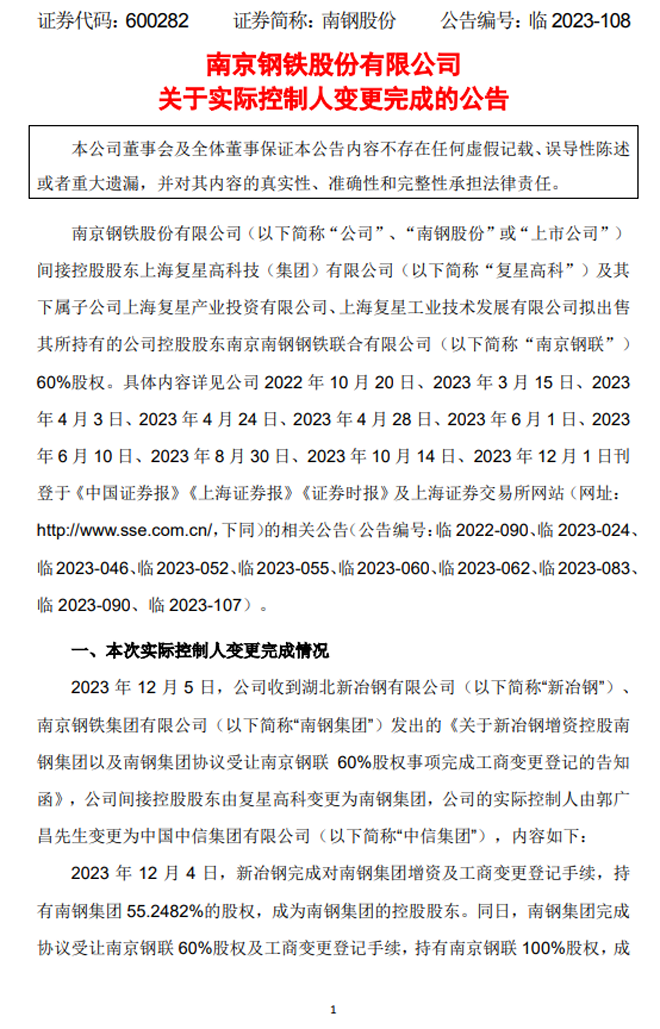 南鋼股份:南京鋼鐵股份有限公司關于實際控制人變更完成的公告