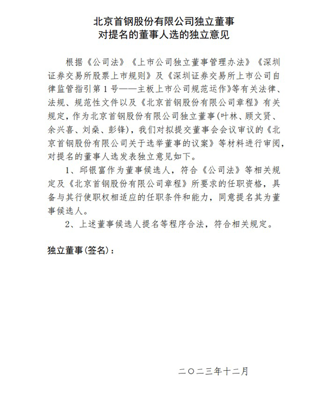 首鋼股份:北京首鋼股份有限公司獨立董事對提名的董事人選的獨立意見