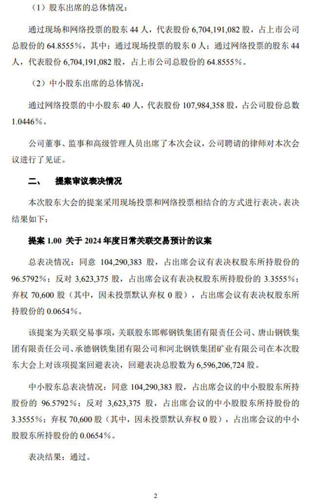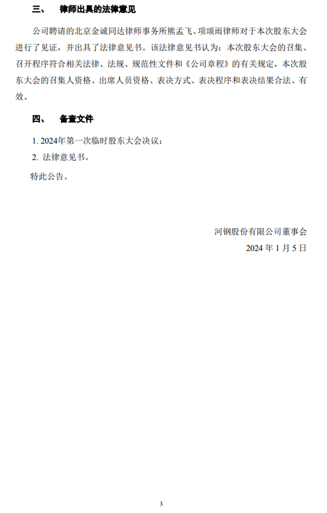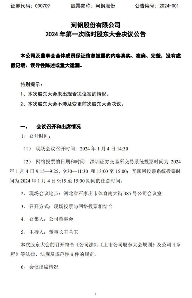 河鋼股份:2024年第一次臨時股東大會決議公告