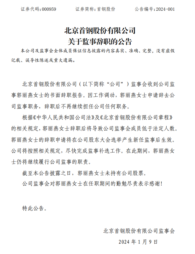 首鋼股份:北京首鋼股份有限公司關(guān)于監(jiān)事辭職的公告