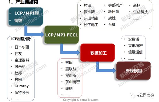 新材料在線?提供的研究材料顯示,LCP與MPI產業鏈上游是樹脂和膜材料,之后加工為軟性銅箔基材,下游為軟板加工和天線模組,在智能手機天線成本組成上,模組環節約占LCP天線價值的30%,軟板環節價值占比約為70%。其中LCP 材料價值占比達到LCP軟板成本15%。