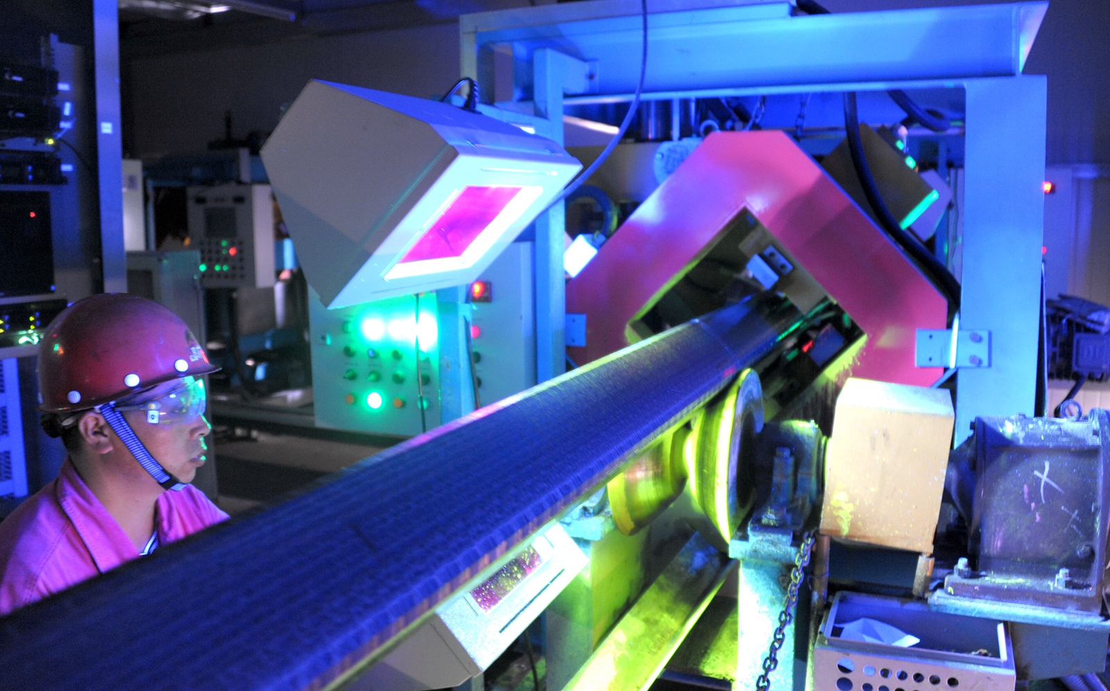 進入9月份以來,沙鋼集團棒線廠以“質量月”為契機,加強工序質量管理,嚴格坯料表面質量檢查,進一步提升了產品質量,為軋制高端線材產品打下堅實的基礎。圖為該廠一塊剛生產出來的坯料正緩慢通過磁粉探傷室。(記者 周麗娜 通訊員 孫靜波 攝)