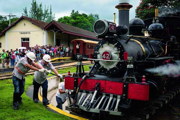 2015年3月22日,米納斯吉拉斯州提拉代特斯車站,在轉盤上掉頭的“瑪麗亞·富馬卡”蒸汽火車。(作者:YASUYOSHI CHIBA)