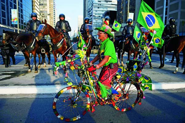 2014年巴西世界杯,一位球迷經過交通管制的保利斯塔大街。(作者:EITAN ABRAMOVICH)