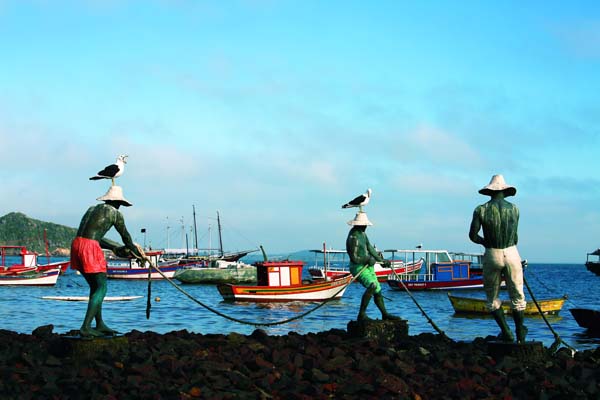 2015年8月2日,海鷗站在里約熱內盧海港邊的漁民雕像上歇腳。(作者:蔡鴻賢)