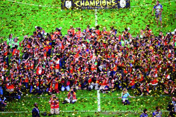 2014年7月12日,來自世界各地的記者們在里約熱內盧拍攝獲得巴西世界杯冠軍的德國隊。(作者:劉占坤)