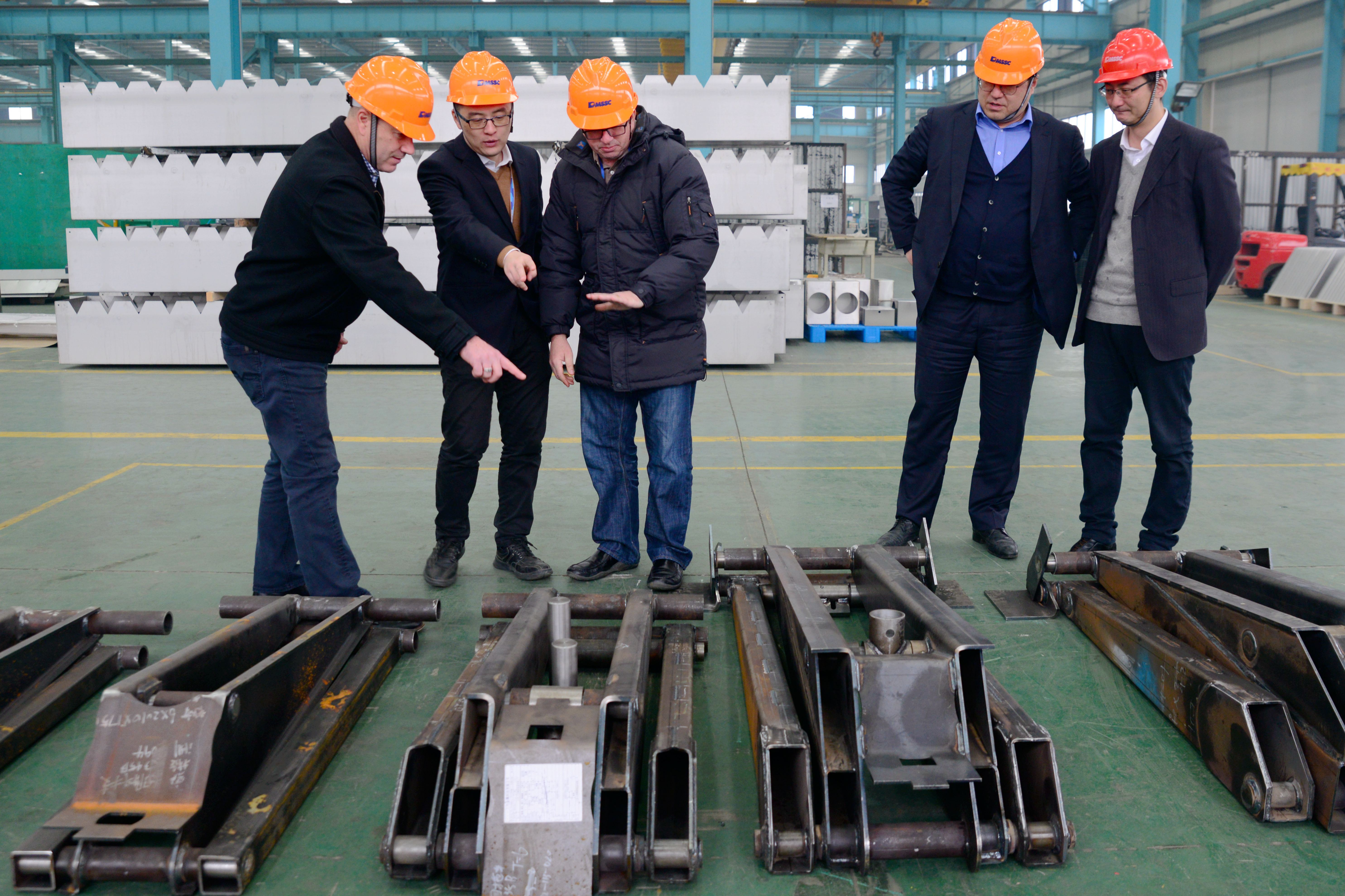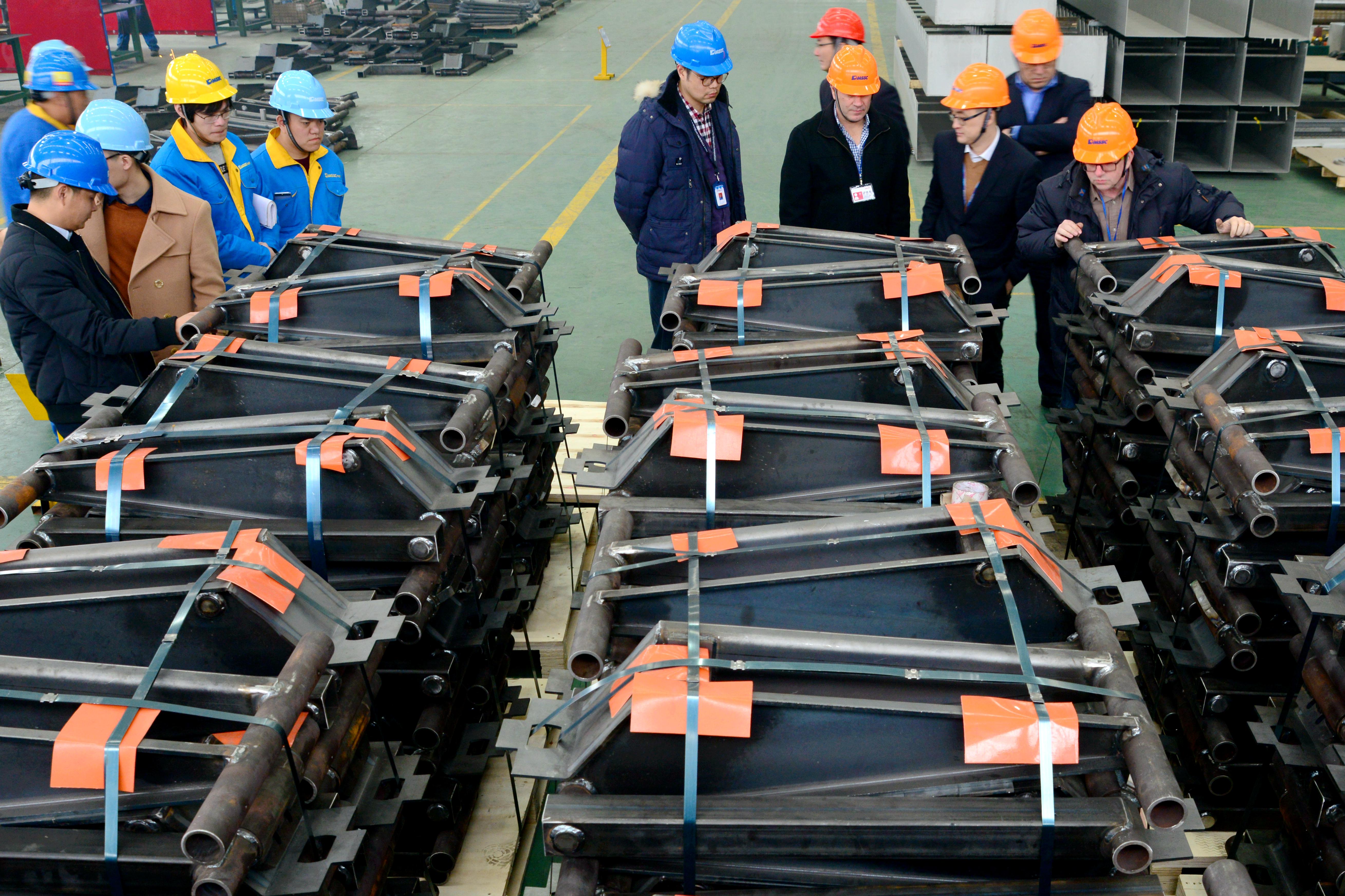 兩位美國商務(wù)代表考察拖車部件加工進(jìn)度。