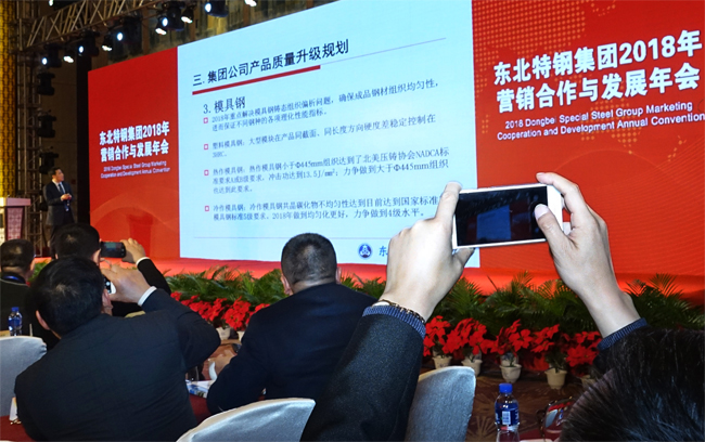 2018年1月24日,混改重組后的東北特鋼集團在大連萬達酒店隆重召開以“新時代新東特新發展”為主題的2018年營銷合作與發展年會。來自國內外290余家重點客戶單位的360余名代表相聚濱城,共商發展。圖為會議上應邀嘉賓作演講。(特約通訊員 劉德斌 攝)