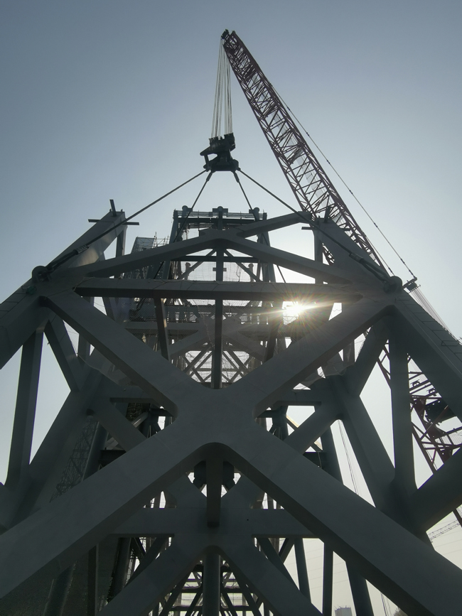 4月22日,作為2022年北京冬奧會唯一一個位于中心城區的雪上項目,首鋼滑雪大跳臺1線柱二節箱型框架柱經過一天的吊裝,順利完成與地埋柱對接,成功躍出地面18米。首鋼滑雪大跳臺共有5組支撐柱,1組埋地柱。其中,1線柱為大跳臺最高支撐柱,自下而上由五節組成,總長66.5米,重550噸。首建集團作為施工單位,按照一次性安裝到位的原則和要求,精心組織、精細施工,全力做好此次吊裝工作。圖為吊裝現場。(孫力 攝)