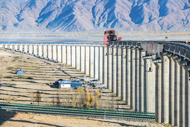 日前,國內第二條進藏鐵路,被稱為“最難建的鐵路”的拉薩至林芝鐵路協榮特大橋已經鋪完鋼軌。據了解,拉薩至林芝段鐵路全長403.1公里,全部采用包鋼生產的鋼軌,設計旅客列車時速達到160公里,建成后將成為從“藏源雅礱”到“雪域江南”的又一天路。圖為協榮特大橋正在鋪包鋼鋼軌。 (記者 白立新 通訊員 中鐵 攝)