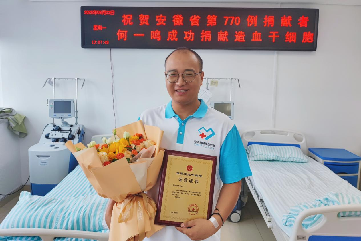 6月18日,何一鳴順利赴合肥入院,為造血干細胞捐獻做最后準備。在完成為期5天9次的骨髓動員劑注射后,6月23日上午,他成功捐獻造血干細胞,成為中華骨髓庫第20399例,安徽省第770例,池州市貴池區第6例,上海寶冶鋼構第1例非血緣造血干細胞捐獻者,為患者重燃生命之光。