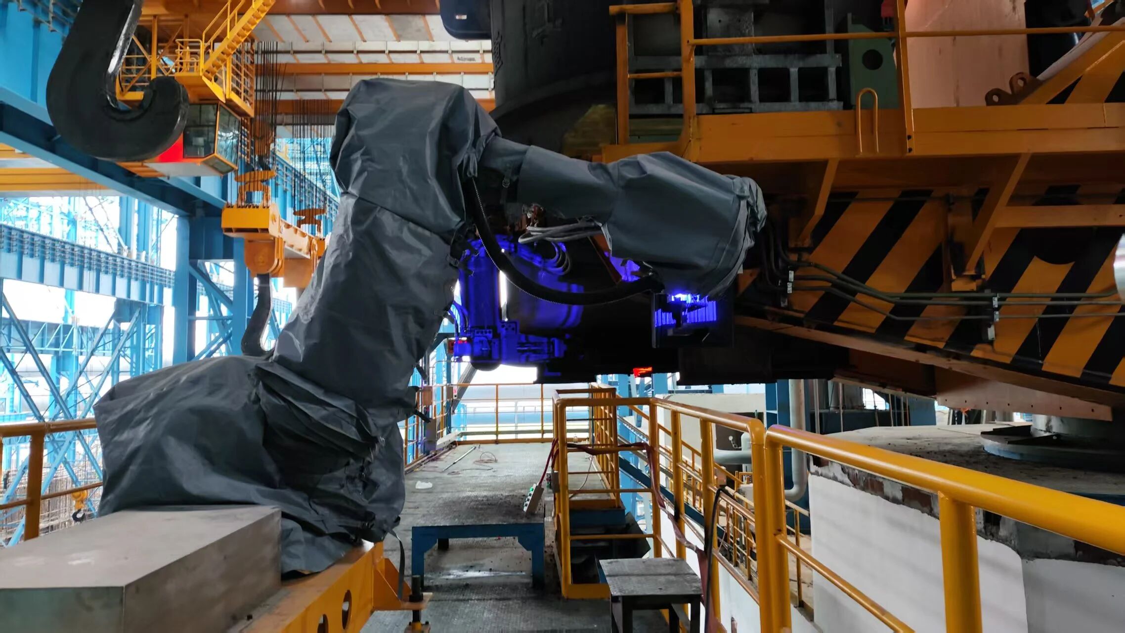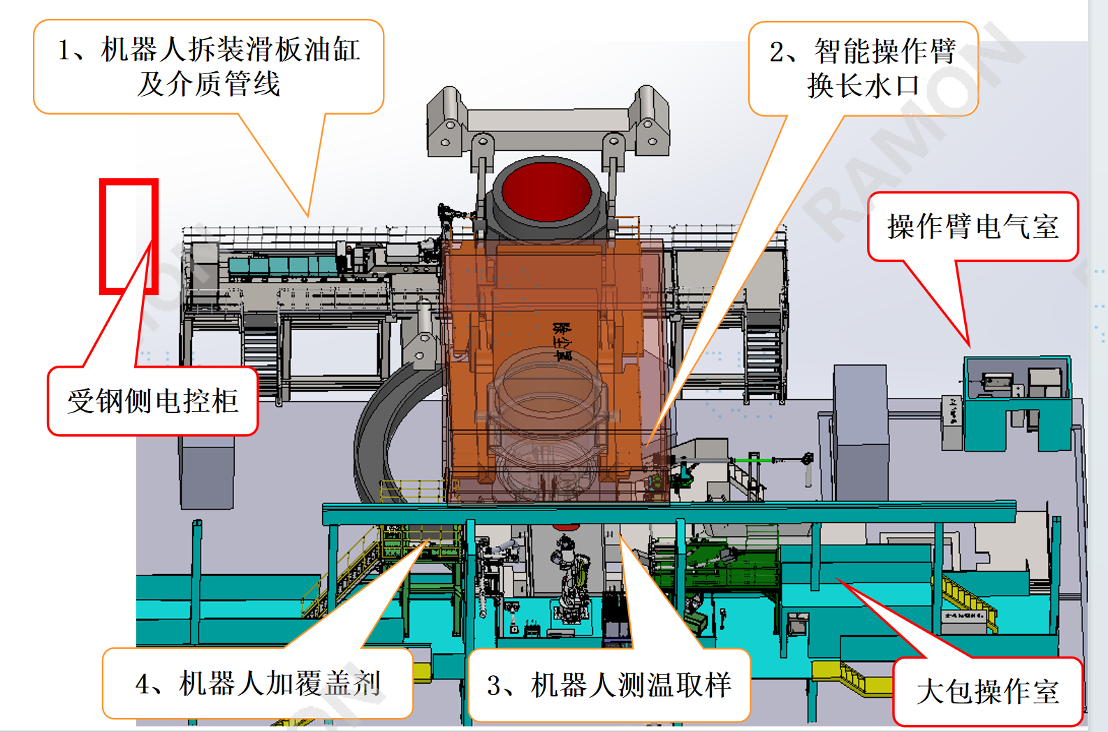 鐳目為周鋼定制的2臺智能澆鋼平臺以工業(yè)機(jī)器人為核心,整合拆裝滑板油缸、智能換長水口、測溫取樣、加覆蓋劑四大關(guān)鍵功能系統(tǒng),構(gòu)建起從鋼水轉(zhuǎn)運(yùn)到澆鑄保障的全流程智能化體系,讓高端鑄機(jī)的生產(chǎn)潛力得到充分釋放,推動周鋼寬厚板生產(chǎn)向更高效、更智能、更穩(wěn)定的方向邁進(jìn)。