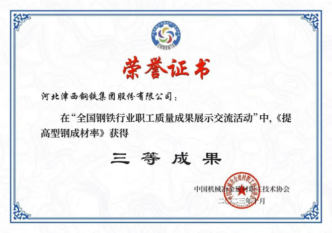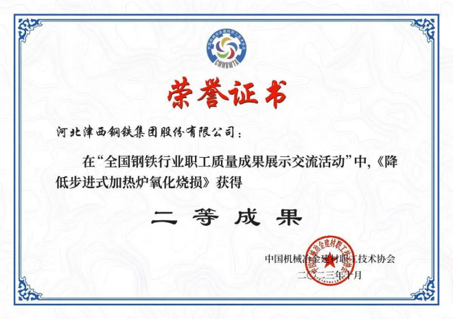 日前,中國機械冶金建材職工技術協會表彰了2023全國鋼鐵行業職工質量成果,津西《降低步進式加熱爐氧化燒損》、《提高型鋼成材率》兩項成果,分獲全國鋼鐵行業職工質量二等、三等成果。