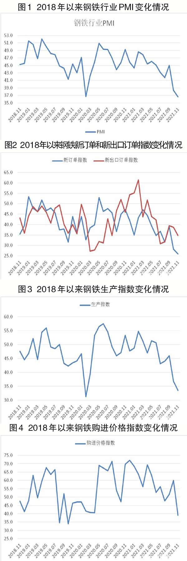 從本會(huì)調(diào)查、發(fā)布的鋼鐵行業(yè)PMI(采購(gòu)經(jīng)理指數(shù))來(lái)看,11月份PMI為36.6%,環(huán)比下降1.7個(gè)百分點(diǎn),鋼鐵行業(yè)繼續(xù)弱勢(shì)運(yùn)行。分項(xiàng)指數(shù)顯示,隨著多地入冬,市場(chǎng)需求整體不佳,鋼鐵生產(chǎn)在環(huán)保限產(chǎn)等政策影響下繼續(xù)下降。原材料成本明顯回落,鋼材價(jià)格也一路下行。預(yù)計(jì)12月份,鋼材市場(chǎng)繼續(xù)低位運(yùn)行,供需兩端繼續(xù)趨弱,原材料價(jià)格或?qū)②叿€(wěn)回升,鋼材價(jià)格小幅震蕩。