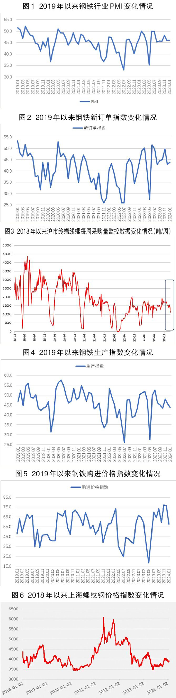 從中物聯(lián)鋼鐵物流專業(yè)委員會調(diào)查、發(fā)布的鋼鐵行業(yè)PMI(采購經(jīng)理指數(shù))來看,1月份為46%,與2023年12月份持平。分項指數(shù)變化顯示,鋼鐵行業(yè)淡季效應(yīng)持續(xù)顯現(xiàn),鋼材市場需求整體下滑,鋼材生產(chǎn)有所收緊,鋼廠庫存有所累積,原材料價格上升勢頭放緩,鋼材價格小幅震蕩下降。預(yù)計2月份,需求端將繼續(xù)收縮,鋼廠生產(chǎn)進一步減少,原材料價格再度回落,鋼材價格微幅震蕩。