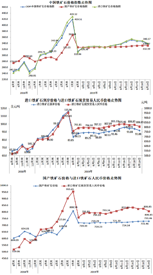 9月19日,中國鐵礦石價格指數(CIOPI)338.97點,環比下降7.10點,降幅為2.05%。其中:國產鐵礦石價格指數為332.59點,環比持平;進口鐵礦石價格指數為340.17點,環比下降8.44點,降幅為2.42%。