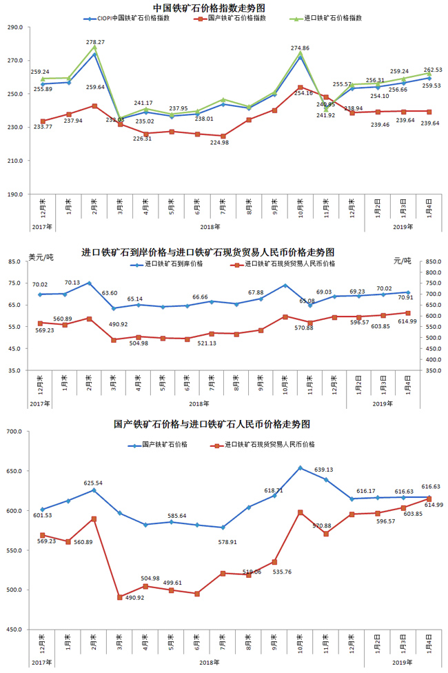 1月4日,中國鐵礦石價格指數(CIOPI)259.53點,環比上升2.86點,升幅為1.12%。其中:國產鐵礦石價格指數為239.64點,環比持平;進口鐵礦石價格指數為262.53點,環比上升3.30點,升幅為1.27%。