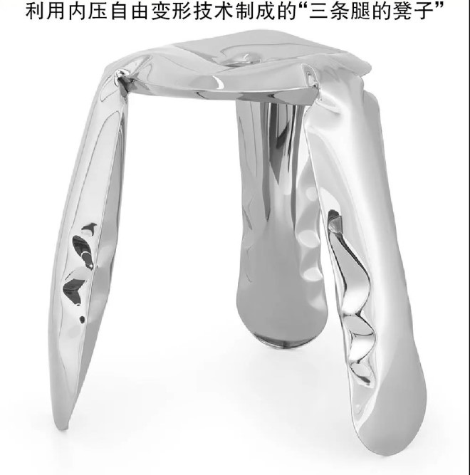 據悉,內壓自由變形技術已經被成功應用在了家具制造領域,該團隊設計的“3條腿的凳子”(如圖)就是采用的該技術。通過向一個閥門充氣,擠壓在一起的鋼板就可以變成一把結實、輕便、時尚的座椅。與機械行業使用的沖壓成型方法不同,依靠這項技術,鋼材在充氣期間不依賴模具成型,使用者甚至可以在家用自行車打氣筒給家具充氣。同時,依靠鋼材的內在強度和創新的內壓自由變形技術,該凳子可以承受大約2噸的重量。
