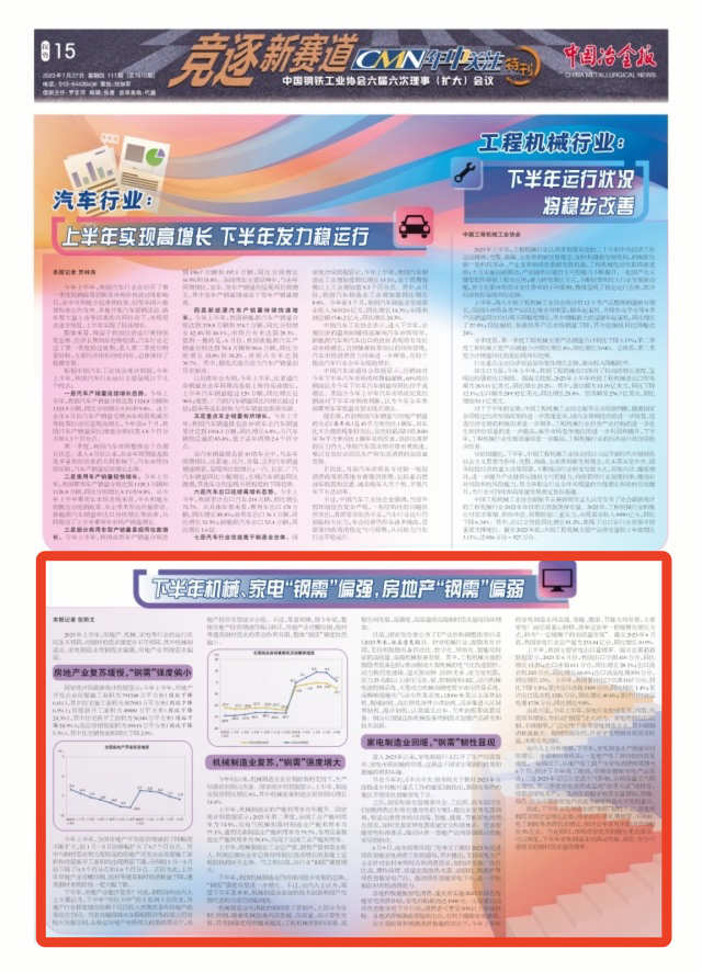 2023年上半年,房地產、機械、家電等行業的運行狀況各不相同,對鋼材的需求強度亦不盡相同,其中機械制造業、家電制造業用鋼需求偏強,房地產業用鋼需求偏弱。