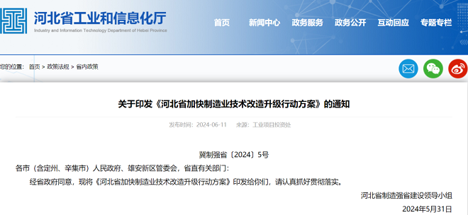 近日,河北省工信廳印發《河北省加快制造業技術改造升級行動方案》(以下簡稱《行動方案》)。