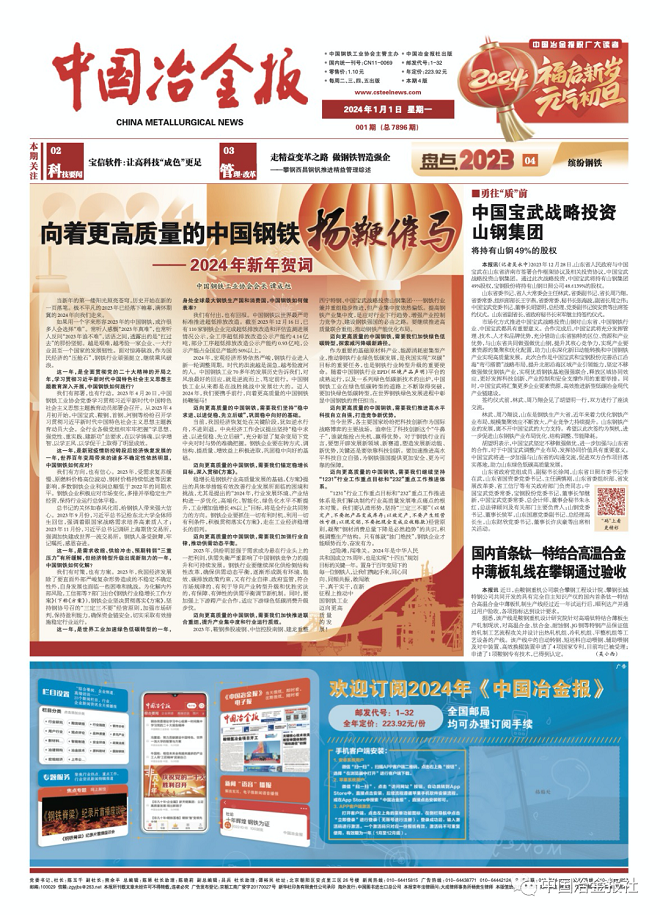 2024年,宏觀經濟形勢依然嚴峻,鋼鐵行業進入新一輪調整周期。時代的洪流越是湍急,越考驗渡河的人。中國鋼鐵工業70多年的發展歷史告訴我們,對風浪最好的回應,就是逆流而上、篤定前行。中國鋼鐵工業從來都是在戰勝挑戰中發展壯大的。邁入2024 年,我們要攜手前行,向著更高質量的中國鋼鐵揚鞭催馬!