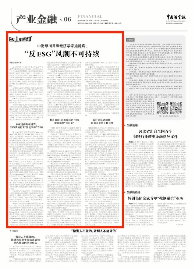 從這些問題出發(fā),《中國冶金報》記者采訪了中央財經(jīng)大學綠色金融國際研究院(下稱中財大綠金院)高級學術(shù)顧問、教授,中財綠指首席經(jīng)濟學家施懿宸。在他看來,近幾年ESG被刻意貼上了“政治化”的標簽,成為股東為追逐短期商業(yè)利益放棄承擔社會責任而尋找的“替罪羊”,但這股“反ESG”的浪潮是不可能持續(xù)的,因為ESG代表著人類文明的進步,是大勢所趨,不可逆轉(zhuǎn)。